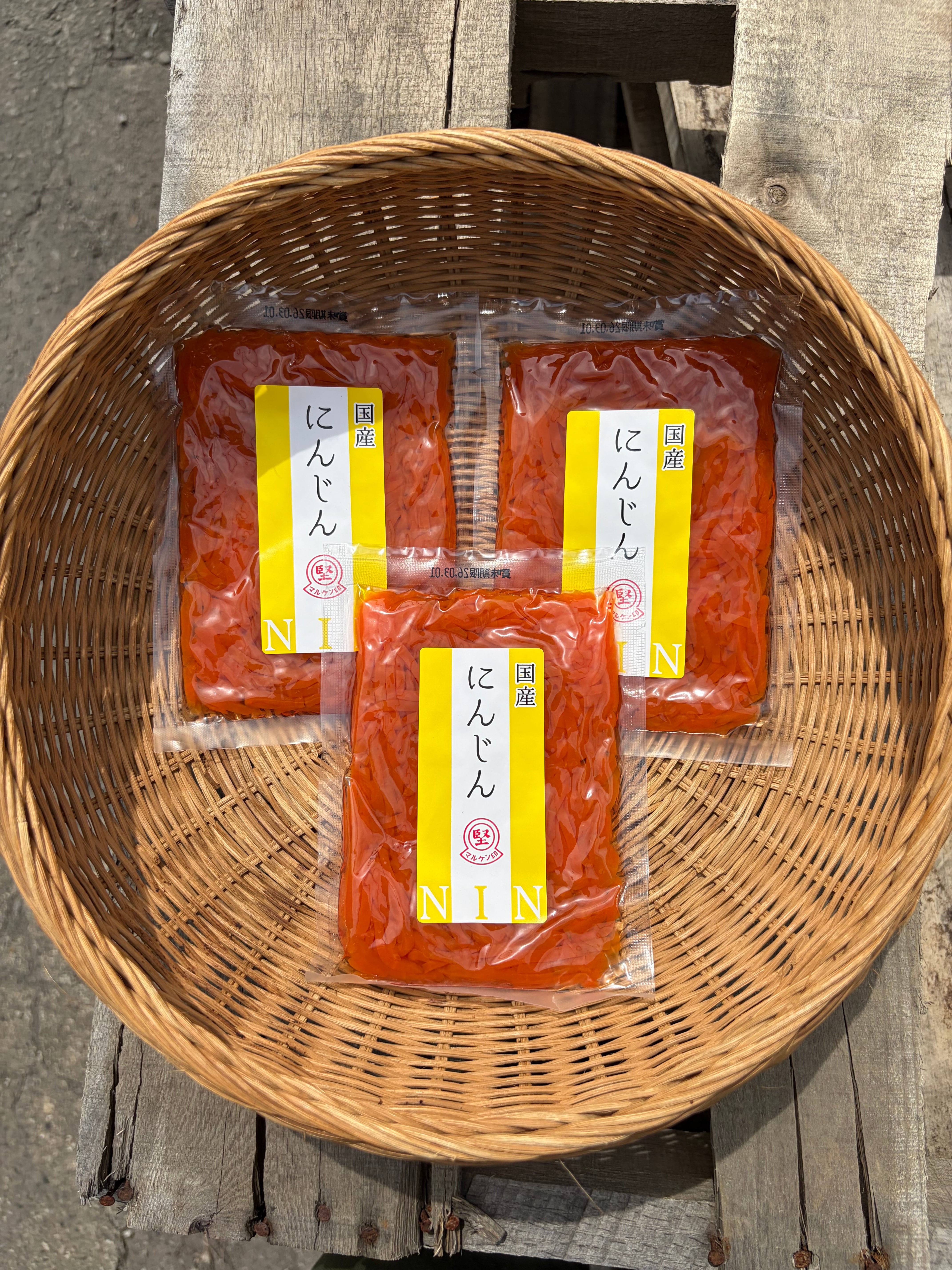 国産にんじんを甘じょっぱく漬け、にんじんの甘みと柔らかなお酢の風味が絶妙にマッチしています。